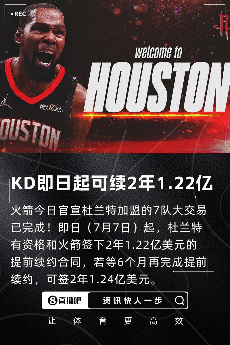历史最大交易!火箭官宣7方超级交易 得到杜兰特和卡佩拉!