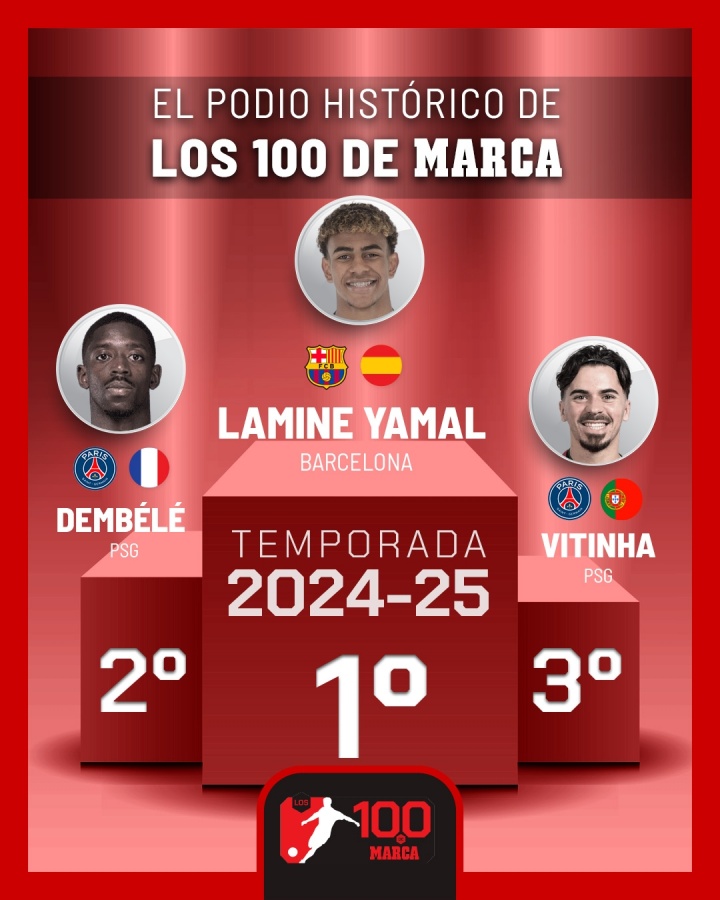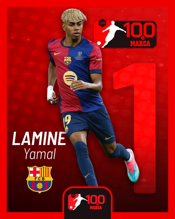07月25日讯 西班牙媒体《马卡报》发起24/25赛季世界足坛百大球星评选,18岁亚马尔当选赛季最佳球员,以超过200分的优势力压登贝莱和维蒂尼亚获奖。