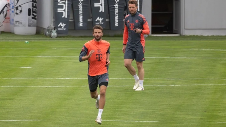 52分钟后训练结束。穆勒收拾了标志碟、训练环和人形障碍模型,还为帕夫洛维奇拾起一件运动衫,随后返回更衣室。新任康复主管本杰明-索默(43岁/8月从法兰克福加盟)也短暂到场观看了草坪训练。