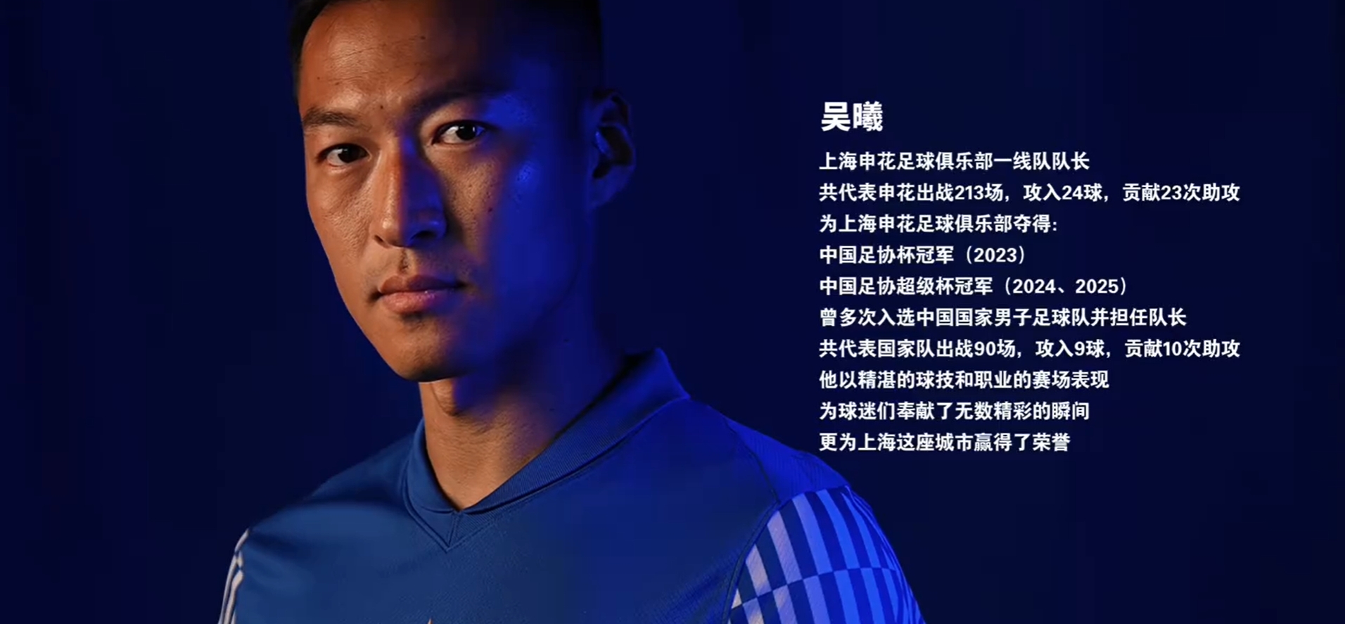 共代表申花出战213场,攻入24球,贡献23次助攻
